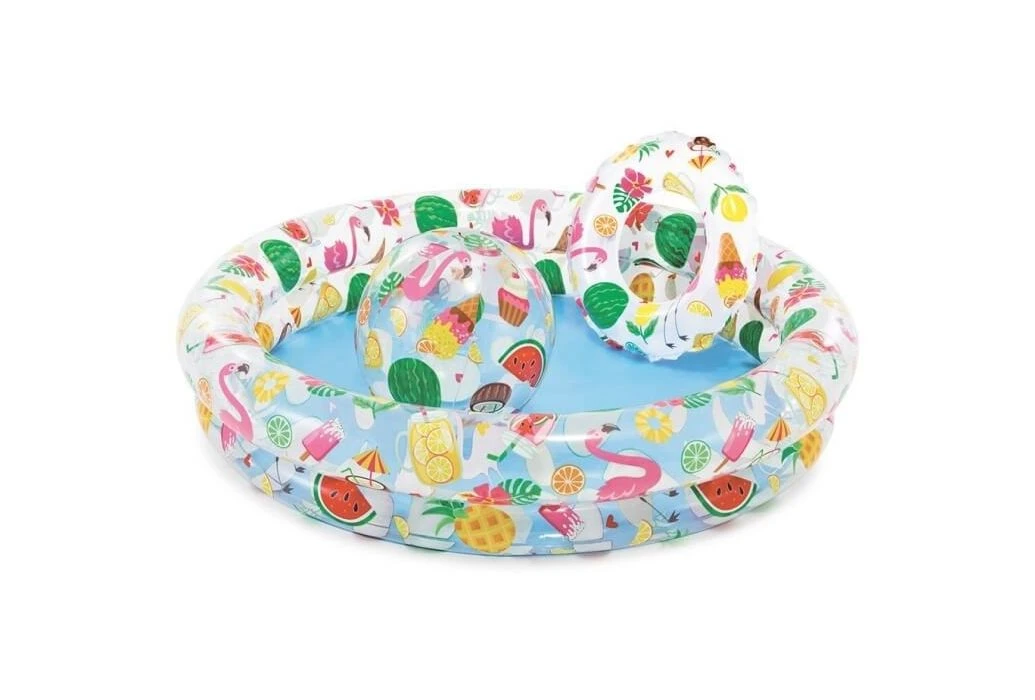 Deze leuke opblaasbare zwembadset Just So Fruity is gemaakt om uren mee te spelen en zwemmen met je vriendjes en vriendinnetjes. Samen met een opblaasbare flamingo, vis of grappige duikstaafjes vermaken de kids zich wel met deze set.